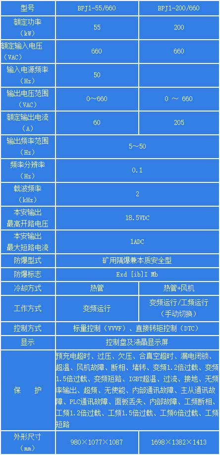 BPJ1系列礦用隔爆兼本質(zhì)******型交流變頻器(以下簡稱為變頻器)是一種集真空電磁起動(dòng)器與數(shù)字式變頻調(diào)速及相關(guān)的散熱技術(shù)為一體的高新技術(shù)產(chǎn)品。變頻器主要應(yīng)用于煤礦井下具有煤塵、瓦斯等爆炸性氣體的危險(xiǎn)環(huán)境中,實(shí)現(xiàn)電動(dòng)機(jī)重負(fù)荷軟起動(dòng)、軟停車和運(yùn)行過程中的變頻調(diào)速控制。具有低起動(dòng)電流、平穩(wěn)的起動(dòng)速度、可調(diào)的起動(dòng)時(shí)間、對電網(wǎng)的沖擊小、輸出力矩大等優(yōu)點(diǎn)。適用于皮帶輸送機(jī)(不包括下運(yùn)輸送機(jī))、乳化液泵、水泵等負(fù)載。